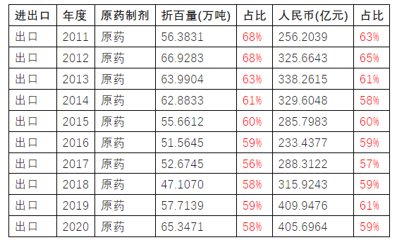 表4 2011—2020年中國原藥出口數(shù)據(jù)分析