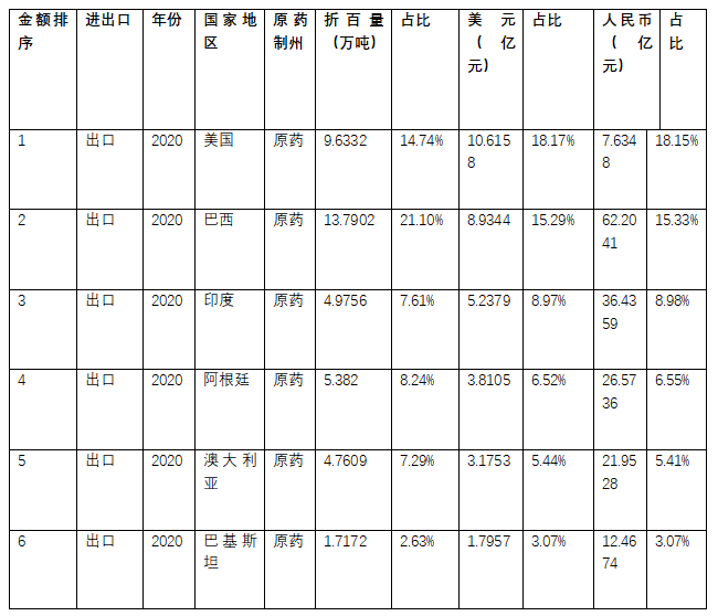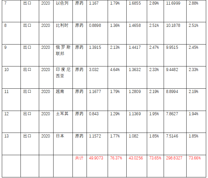 表7 2020年中國原藥出口國家情況分析