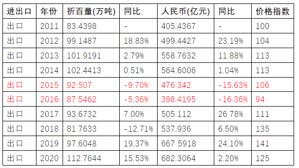 2011—2020年中國農(nóng)藥進出口數(shù)據(jù)統(tǒng)計