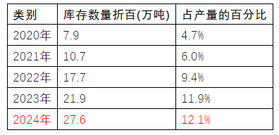 原藥企業(yè)庫存增多。近5年,農(nóng)藥原藥庫存逐年增加,2024年農(nóng)藥庫存數(shù)量達到27.6萬噸,占當年產(chǎn)量的12.1%,農(nóng)藥的生產(chǎn)過剩問題初步顯現(xiàn)。