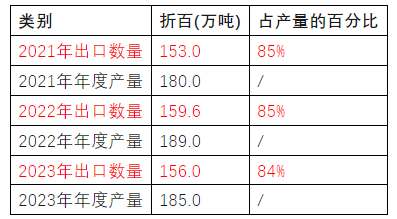 近5年,中國農(nóng)藥出口數(shù)量(折百)大幅增加,共出口786萬噸,同比增長73%;年平均為157萬噸,同比增長74%。2021、2022、2023年出口數(shù)量占當年產(chǎn)量的85%左右。