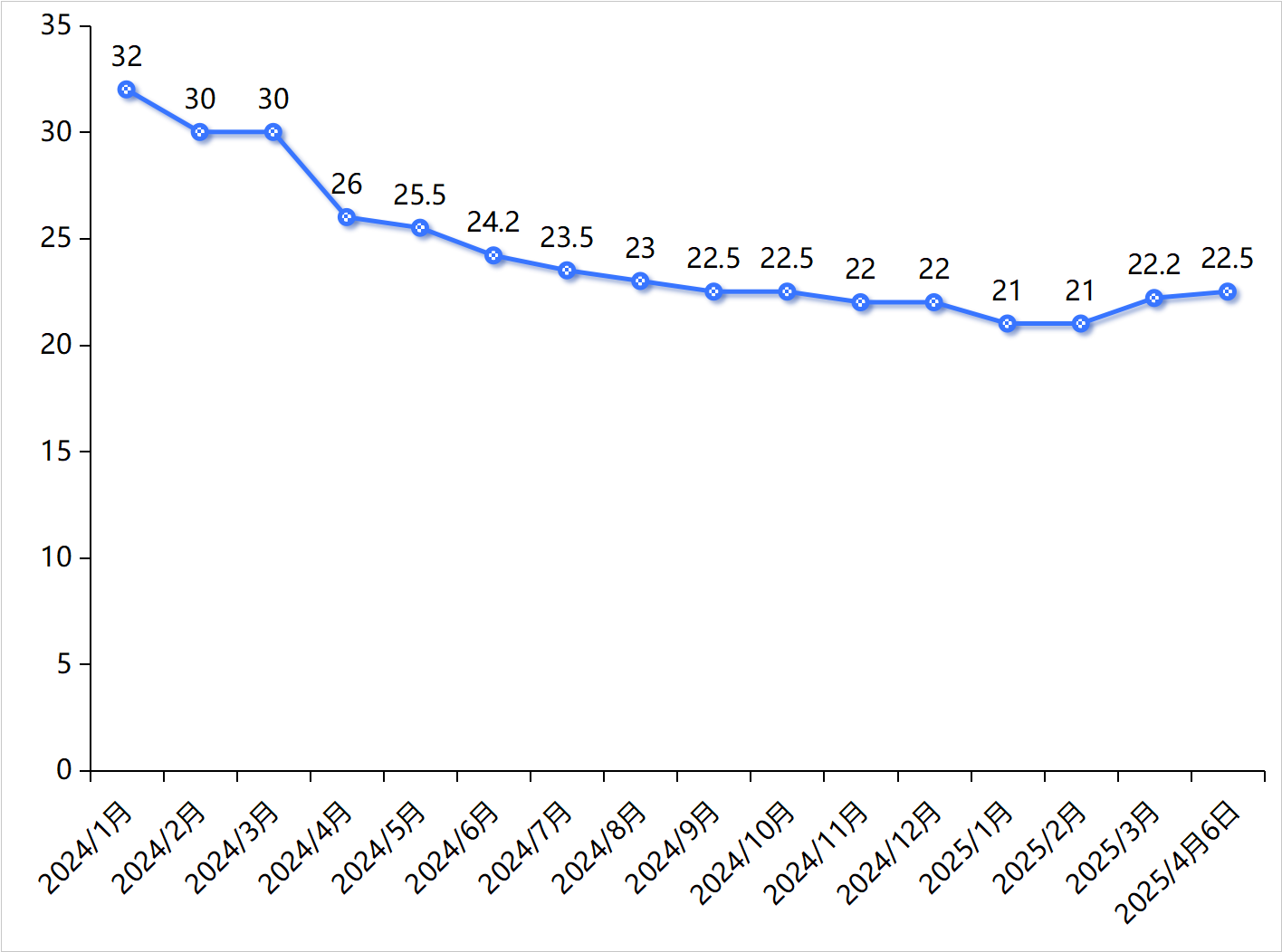 圖1 2024年1月~2025年4月6日氯蟲苯甲酰胺原藥價格走勢(單位:萬元/噸)