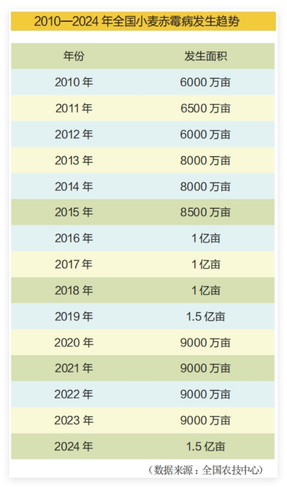全國農(nóng)技中心數(shù)據(jù)顯示,2024年全國小麥赤霉病總體依舊偏重流行,發(fā)生面積達(dá)到1.5億畝,需預(yù)防控制面積2.5億畝次以上。
